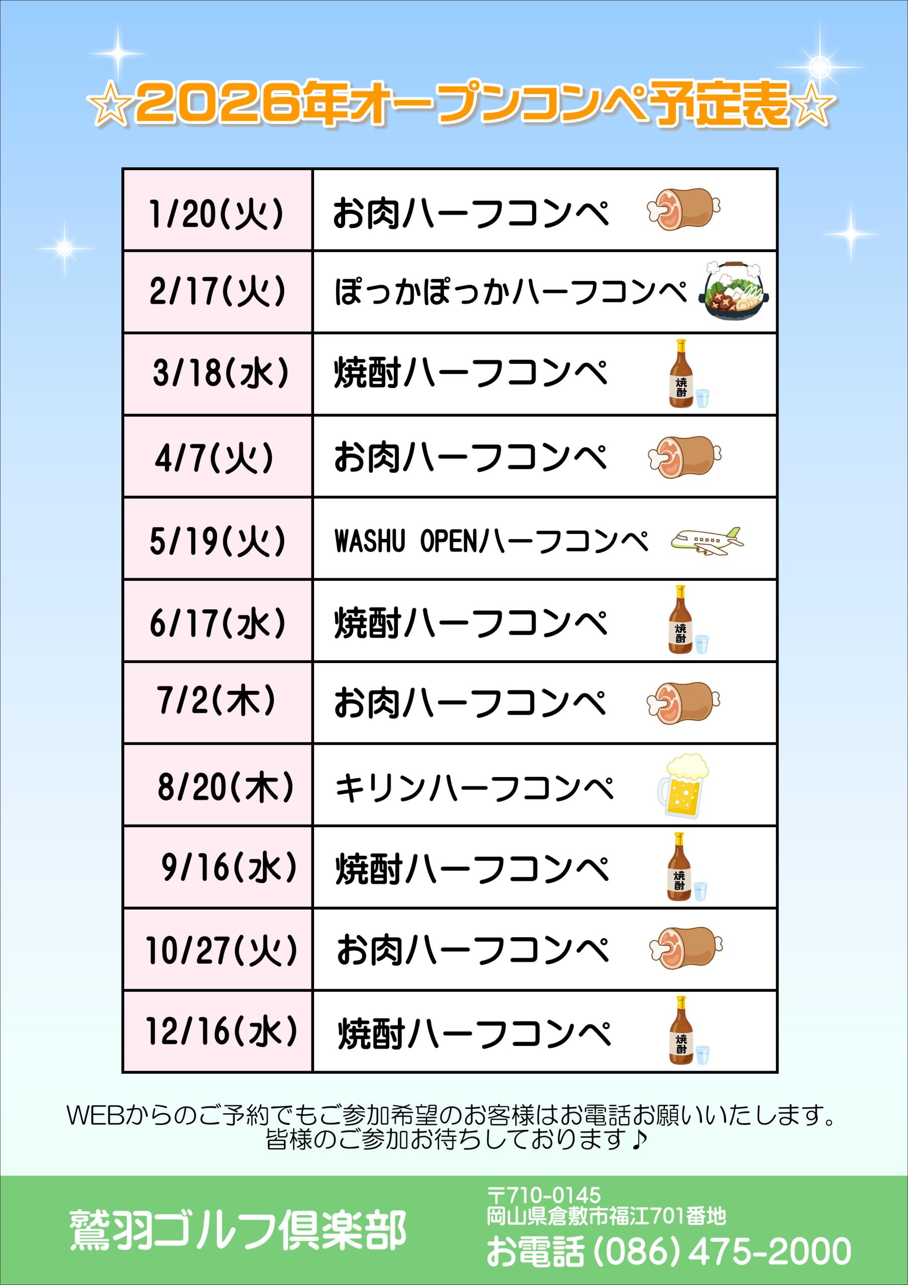 2026.01.04 フレンドリー会員年間予定のお知らせ 2026.01.01 新年のご挨拶 2025.12.24 2026年オープンコンペのご案内